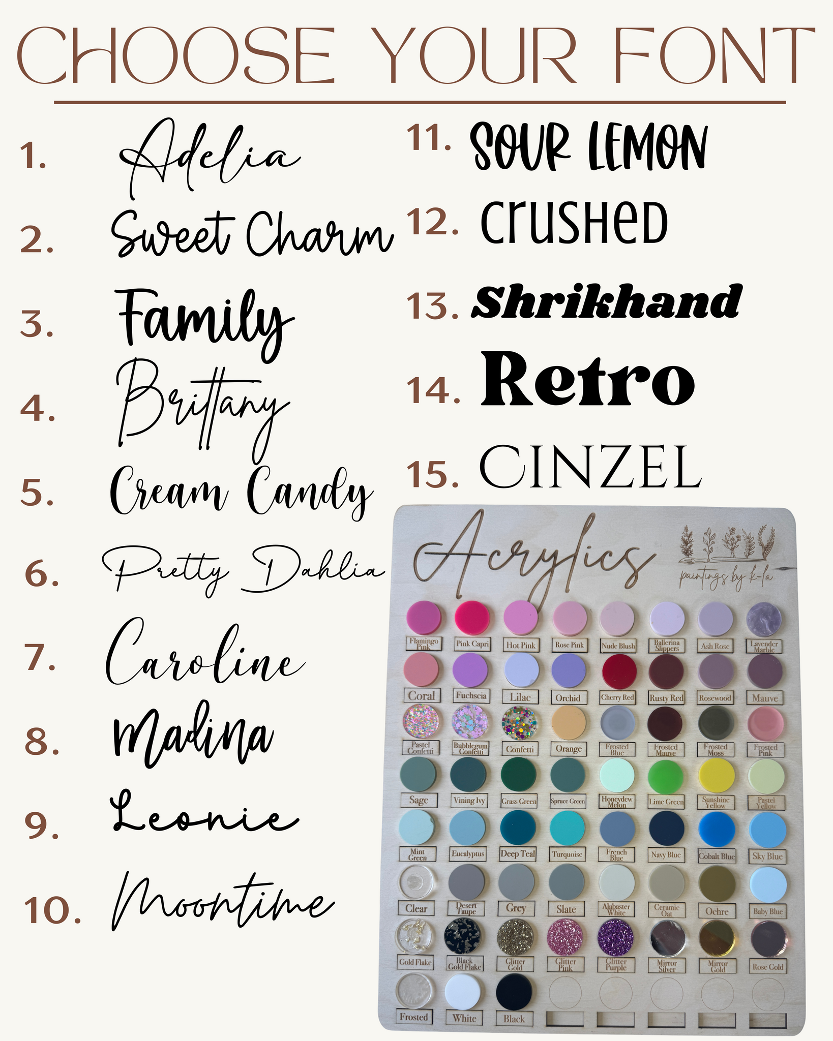 - Add an Acrylic name (choose your font & acrylic colour)